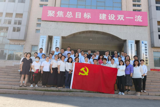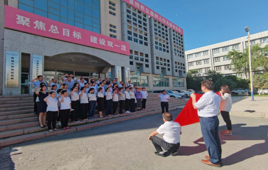 为庆祝中国共产党建党100周年,深入学习贯彻党史学习教育,践行党的初心与使命,2021年7月1日上午,集体观看完庆祝大会盛况后,经济与管理学院全体党员教师来到北校区西院图书馆前进行了“党旗映天山”重温入党誓词活动,全体院领导、党员教师48人参加活动。