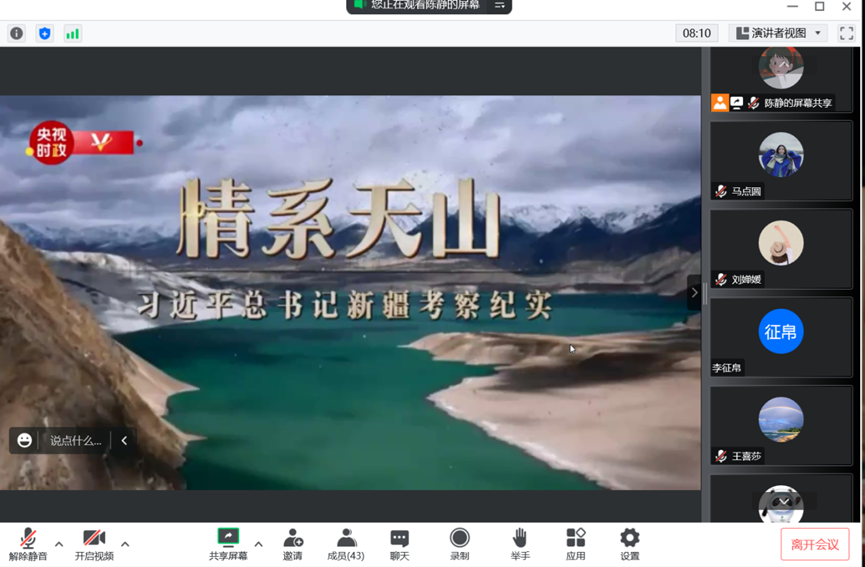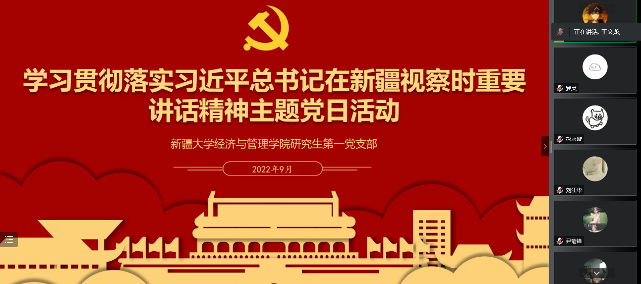 为深入学习贯彻落实习近平总书记在新疆视察时、特别是在新疆大学视察时重要讲话精神,切实把研究生党员的思想行动统一到讲话精神上来,经济与管理学院各研究生党支部近期召开学习贯彻落实习近平总书记在新疆视察时重要讲话精神主题党日活动,活动以线上方式开展。本次主题党日活动共分为两个阶段,第一阶段是学习贯彻落实习近平总书记在新疆视察时重要讲话精神和《情系天山——习近平总书记新疆考察纪实》纪录片的观看,第二阶段是围绕“作为中国特色社会主义、为中华民族努力奋斗的一代青年”进行学习讨论。