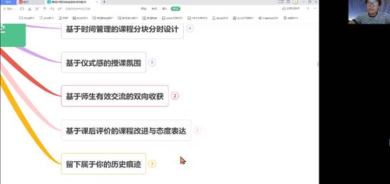 接着,伏文艳老师用思维导图工具,以精准对需的就业指导课程教学为主题,从授课中的“变”与“不变”、基于需求和成长导向的课程教学设计、基于广泛吸收的授课知识储备、基于师生有效交流的双向收获、基于课后评价的教学改进与态度表达等五个大方向进行阐述。她结合自身多年的授课经验,提出要精准对接当代大学生的个性特点和职业预期,从授课内容设计与课程环节设计,教学资源的便捷获取办法,授课知识储备来源,分块分时的课堂时间安排,教学氛围的提升,促进师生双向交流以及后期改进等诸多方面分享了自身的教学经验和心得,可谓“干货满满”。伏文艳老师在分享中特别提到,这门课的教师给学生留下的不仅是知识技能财富,还有长期支持辅导渠道,教师在这门课程中可以更好地引导学生“把自己的小我融入祖国的大我、人民的大我之中,与时代同步伐、与人民共命运,更好实现人生价值、升华人生境界”,把个人职业生涯科学发展同国家社会需要紧密结合,“立大志、入主流、上大舞台、干大事业”,到祖国最需要的地方建功立业。
