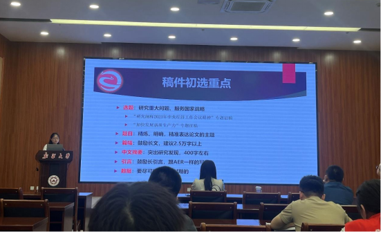 系列活动二:6月1日19:00-20:00,举办“c刊编辑讲论文”活动。《数量经济技术经济研究》《中国经济学》编辑部两位副主任焦云霞副编审和陈星星副编审分别介绍了两本期刊及选稿情况,围绕期刊办刊理念、选题方向、评审流程、投稿建议等进行全面讲解,并与参会代表进行互动交流,现场气氛热烈。经济与管理学院50余位研究生参加本次活动。