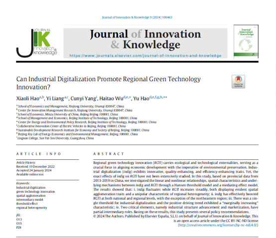 近日,经济与管理学院经济学专业2019级本科生梁益(导师:郝晓莉)的论文《can industrial digitalization promote regional green technology innovation?》在国际期刊《journal of innovation & knowledge》2024年第9卷第1期发表。