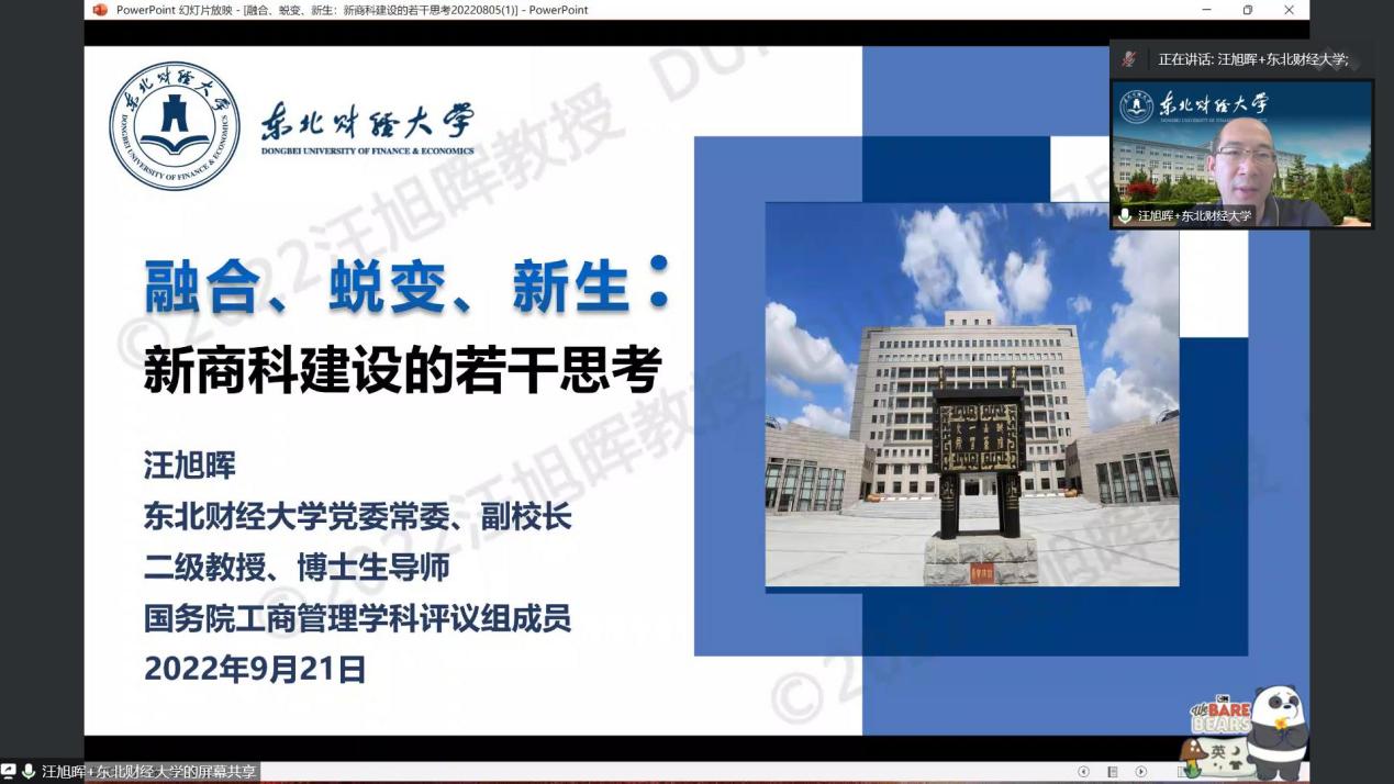 2022年9月21日下午,经济与管理学院邀请东北财经大学党委委员、副校长汪旭晖教授通过腾讯会议做了名为《融合、蜕变、新生:新商科建设的若干思考》的讲座。学院全体教工、商学院全体教工及部分学生参加会议,共计140余人。经管学院孙景兵院长主持讲座。