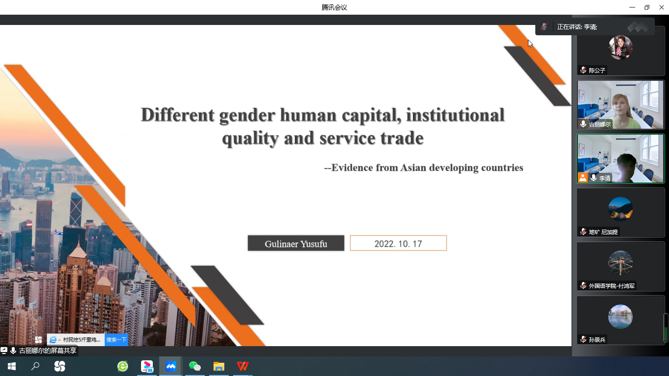 古丽娜尔·玉素甫老师的报告以different gender human capital, institutional quality and service trade --evidence from asian developing countries为题,利用亚洲发展中国家面板数据,基于熵值法测算了不同性别的人力资本和制度质量,利用动态面板(sys-gmm)模型,实证分析了不同性别人力资本对服务贸易进出口的影响,并进一步探讨了制度质量的调节作用。
