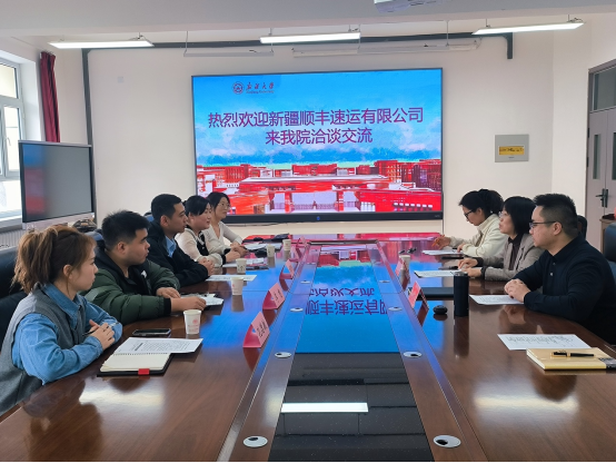 座谈会上,经济与管理学院副书记苗健对顺丰速运的到访表示热烈欢迎,对近年来学院与顺丰公司在共建社会实践基地方面取得的成绩表示肯定。马晓东副院长介绍了学院在学科建设、人才培养及学生实习实践等方面的情况,强调产教融合对提升应用型人才培养质量的重要意义。新疆顺丰速运有限公司区域总经理杨骐鸣重点阐述了企业在智慧物流、供应链管理等领域的技术优势与发展规划,表示期待通过校企资源共享,在校园末端服务优化、数字化管理平台搭建等方面形成合作突破,在促进与高校的交流联系中,形成长效的沟通合作机制,形成校企合作的共赢合力。