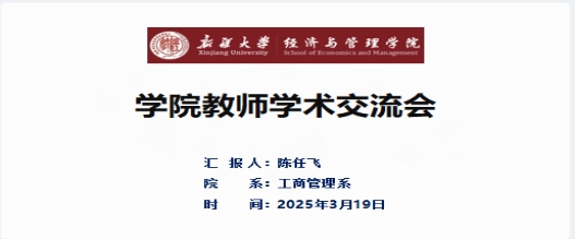 为强化学科发展和有组织的科研,构建开放包容的学术生态,赋能青年教师、博士后和博士生学术成长,我院于2025年3月19日中午14:00-15:30在11号教学楼216会议室召开了第一次学院教师学术交流会。本次会议由经济与管理学院副院长曾燕主持,学院党委书记朱新武、副院长马晓东、学术副院长向洁以及部分青年教师、博士后、博士生参加。陈任飞、汤振朋、姚孟超、杨历、乐凯迪、张晓婧、甫祺娜依·尤力瓦斯等7名青年教师先后进行汇报。