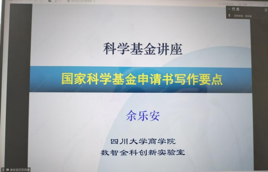 为切实促进经济与管理学院教师国家自然科学基金项目的申报工作,提升项目选题的前沿性与论证质量,经济与管理学院于2025年12月2日下午14:30在腾讯会议上举办了一场辅导讲座。本次会议由四川大学海纳特聘教授余乐安教授主讲,学院副院长曾燕主持,50余位青年教师积极参加了此次会议。