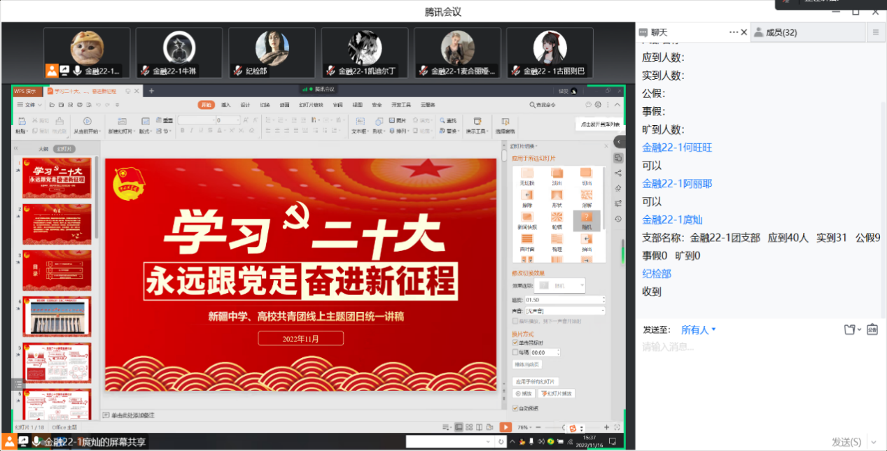 党的二十大是在我国迈上全面建设社会主义现代化国家新征程、向第二个百年奋斗目标进军的关键时刻召开的一次十分重要的大会,举国关注、世界瞩目。党的二十大从战略全局深刻阐述了新时代坚持和发展中国特色社会主义的一系列重大理论和实践问题,科学谋划了未来一个时期党和国家事业发展的目标任务和大政方针,在党和国家历史上具有重大而深远的意义。经济与管理学院于2022年11月16日通过线上团课的形式开展“学习二十大、永远跟党走、奋进新征程”主题团日活动,学院高度重视本次活动的开展,提前下达学习要求,组织学生积极参与活动。