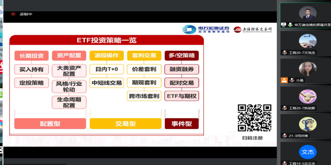 诸佳维老师介绍了etf的起源与发展、基金产品种类和特征,重点给同学们讲解了基金投资策略。最后讲述了对证券市场未来行情展望、以及如何做好基金投资的个人见解。