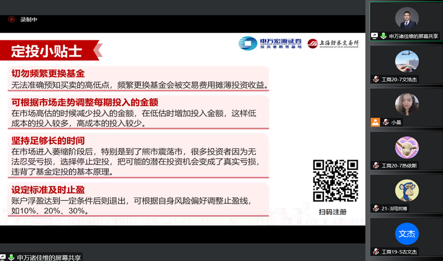 本次讲座紧密联系证券市场、家庭理财的实际,帮助同学树立投资理财意识,增加对基金产品的认识,了解到etf投资策略和基金定投的技巧,同学们学习兴趣非常高。讲座结束后,同学们踊跃提问,老师耐心的为大家一一解答。