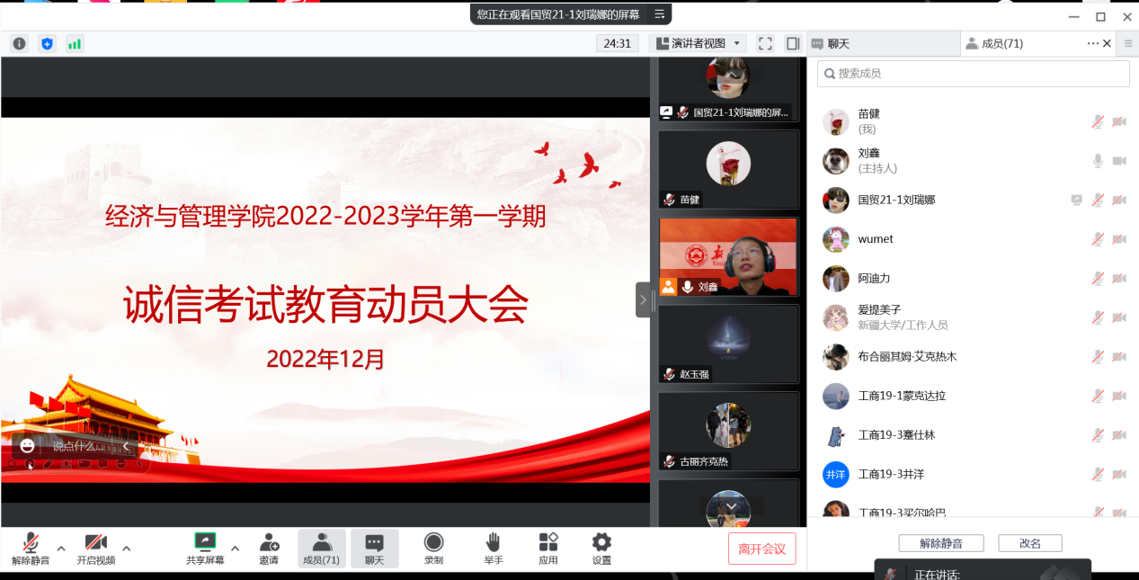 为深入贯彻落实党的二十大精神,将习近平总书记考察新疆大学时所说的“育人的根本在于立德”贯穿于教育的全过程中,进一步加强考风考纪教育,将考试诚信作为学生思想政治教育成果的重要衡量指标,努力营造公平、公正、诚实、守信的考试环境,促进我院学风建设在守正创新中稳步推进,切实使我院学生积极沉着备考,规范诚信应考,2022年12月10日20:00学院通过腾讯会议加钉钉转播的形式开展2022-2023学年第一学期诚信考试教育动员大会。
