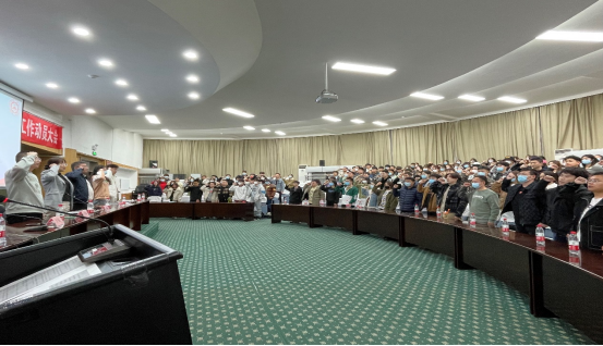 大会第九项,苗健副书记以三个关键词——“责任”“荣誉”“纪律”针对本次大会做总结讲话,苗书记说:“千言万语,社区工作需要发挥学生自我管理、自我服务的作用,落实好管理教育的最后一公里,希望全体社区学生干部用“时时放心不下”的责任感投入到宿舍文明创建的工作中,履职尽责、模范带头、团结互助,确保学生社区建设安全文明、健康和谐的育人环境。”最后,于斌老师带领大家进行宣誓“我是经济与管理学院楼层长/班组长/宿舍长,我宣誓:发扬志愿服务精神,服从学院社区指挥,认真履行职责,严守校纪校规,认真查寝,维护安全,为创建文明宿舍、建设平安和谐美好校园环境贡献力量。”。全体同学紧握右拳,精神饱满,神情严肃,斗志昂扬。