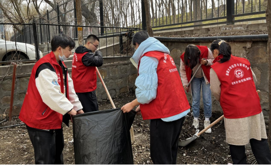 活动伊始,学院新时代文明实践志愿者服务队的同学们在工作人员的安排下,准备好了工具,在老干处门口的树林带集合,大家认真地用耙子把枯枝败叶清理出来,再把这些枯叶装进袋子,扔到指定的垃圾箱。