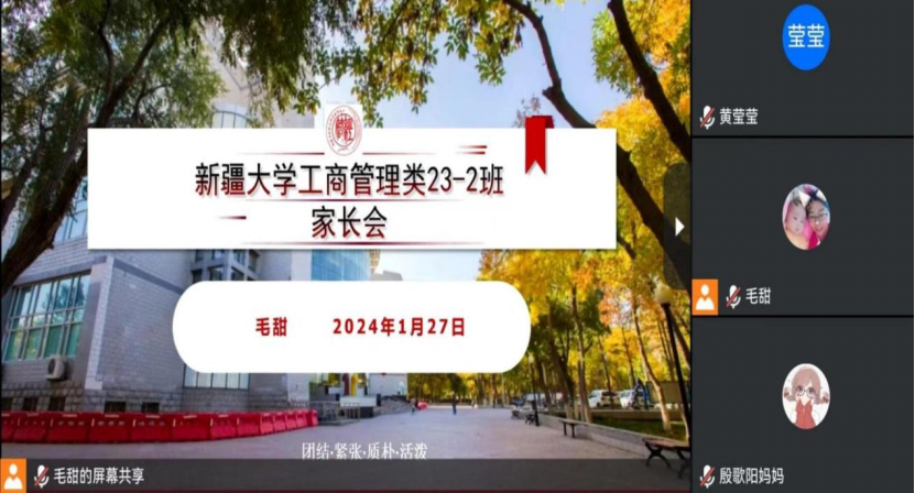 每一份温暖的教育,都是从相知开始,在相携中升华。为促进学院与家长之间的沟通与交流,凝聚家校教育合力,共同寻找最佳的教育方法,让同学们度过一个健康、祥和、文明、安全的假期。根据经济与管理学院党委安排,我院于寒假期间2023级本科生各班级开展线上家校联系会暨本科生导师制动员大会。让我们一起走进班主任毛甜老师所带的工商管理类2023-2班进行观摩,在互学交流中强化班级管理,在反馈激励中深化家校情谊。此次家校联系会主要内容是围绕本学期学生在校表现情况、在校生活情况、寒假安排、本学期学生成绩以及本科生导师制这五部分进行反馈,以便让家长更加全面了解孩子们的在校情况,进而对学生的假期生活有目标性的进行规划引导,与家长一道努力将学生培养成为一名德智体美劳全面发展的新时代青年,拥抱美好的未来。