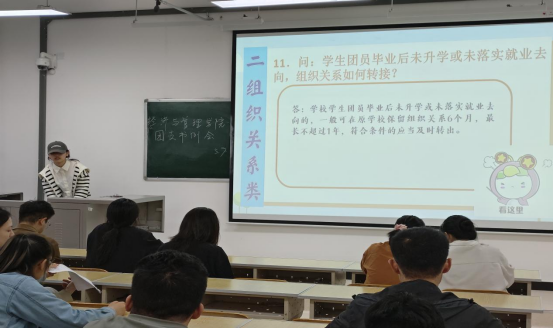 其次,为了促进我院“智慧团建”系统工作的科学化、规范化、为毕业生团组织关系转接工作打下坚实的基础。主持人带领大家集中学习了相关文件,着重讲解线上(“智慧团建”系统)团组织关系转接工作和线下团组织关系转接工作相关注意事项,详细说明“智慧团建”团组织关系转出工作的操作流程、毕业生去向分类、时间节点等相关工作要求。随后,主持人针对各班团支书所提出来的问题进行了详细的解答,确保团干部对团员组织关系转接有着清晰的认识。团干部在明确好相应要求后,能够更好地向团员们传达信息。