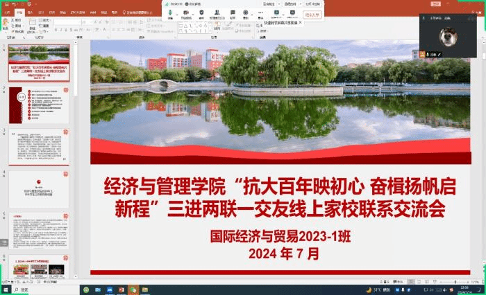 在喜迎新疆大学建校100周年之际,为落实立德树人根本任务,推动教育高质量发展,将“三全育人”理念贯穿至学生德智体美劳全面发展过程,促进家校协同育人,推进优良院风、班风、舍风的养成,在深化落实“三进两联一交友”活动的背景下做好学生暑假期间安全稳定和社会实践工作,服务学生,联动家长,使家长在能够充分了解孩子学业发展与现实表现的基础上,与学院教育管理形成合力。根据新疆大学党委学生工作部要求,学院党委统筹部署,我院大一至大三共计28个本科班级于2024年7月10日——7月17日间组织开展“抗大百年映初心 奋楫扬帆启新程”三进两联一交友线上家校师生联谊交流会。本次联系会各班级邀请班级学生、学生家长、副班主任、学业导师、“三进两联一交友”结对教师共同参与,班主任为主持人。会议共计9项议程,涉及学院2024年上半年学生工成绩、班级基本情况、暑假思想政治引领等多项内容,会议涵盖内容全面饱满。