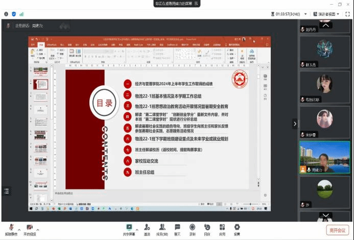 各班级采用腾讯会议的形式开展,会前学工办统一班会模板,各班班主任结合专业年级和班级情况认真制作ppt课件和讲稿。班主任、副班主任、学业导师、“三进两联一交友”结对教师提前进入线上会议做好相关准备。待各位同学、家长进入线上会议室后,班主任亲自考勤,确保本次会议高质量开展。联谊会伊始,班主任对学生及家长的到来表示热烈欢迎,对家长们配合学院安排,合力共助成长的莅临表示感谢,对本次参加会议的老师和会议议程进行了介绍(1.2024年上半年学生工作取得的成绩2.介绍班级上学期基本情况3.介绍班级思想政治教育活动开展情况4.介绍“第二课堂学时”和“创新创业学分”对毕业的影响5.督促2024年暑期社会实践务实开展6.班级展望7.解读校历8.家校互动交流9.班主任总结);班会正式开始,各班班主任重点围绕班级基本情况和暑期安全教育进行解读,从课程学习、考勤(上课 晚自习)、学科竞赛、奖助学金评选、入党入团、参与校园文化活动6个方面对班级本学年的工作进行总结,认真结合成绩单,参照每名学生的在校现实状态,直面学生各类问题,剖析成绩背后的行为逻辑。