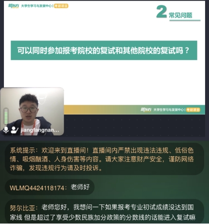 为帮助即将毕业的困难学生更好地准备考研复试和调剂,新疆大学经济与管理学院联合新东方前途出国有限公司,于3月4日(周二)17:00-18:00举办了一场主题为“2025考研复试调剂讲座”的线上直播活动。此次活动旨在通过专业的指导和一对一的答疑服务,帮助困难学生提高考研复试和调剂的成功率,实现他们的考研梦想。