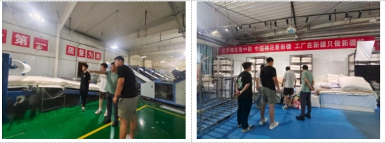 在棉被生产区,实践团队看到了另一番景象:经过梳理的棉絮被均匀铺展,通过铺网机叠合成一定厚度,再经压棉机压实定型,最后缝制包边,一床床厚实的棉被便制作完成。负责人介绍了从棉花筛选到成品包装的全程质量追溯系统,使团队成员对企业的品控体系有了清晰认识。