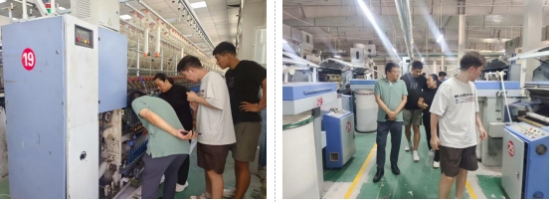 在纺纱车间,环锭纺与气流纺生产线有序运转,技术人员简单介绍了细纱机的基本原理,且其生产出的涤纶棉纱主要适用于中高端针织面料生产。团队成员注意到,车间通过中央控制系统实现了纺纱速度、捻度的实时监控,设备自动化率较高,较传统生产线大大减少了人工成本。
