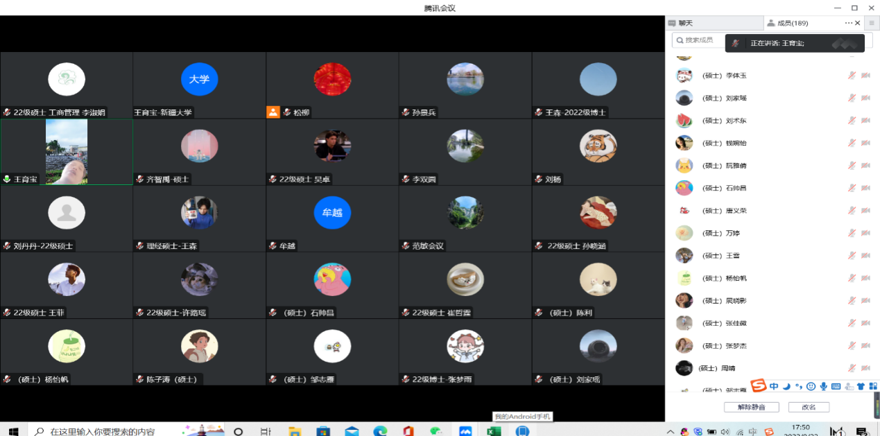 为做好入学教育工作,帮助2022级研究生新生尽快熟悉校史院情、了解学校有关研究生的管理规定,明确学习科研目标、做好职业生涯规划,顺利完成本研对接、硕博转换,我院按照学校党委学工部的部署要求,于9月22号下午,通过线上腾讯会议的学习形式,邀请我院全体导师、全体22级硕博研究生共同学习了研究生管理规定等方面的内容。会议由孙景兵院长主持。
