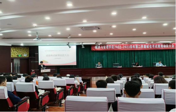 期末将至,为帮助我院同学尽快进入复习状态的同时,树立良好的考风、考纪,进一步规范考场行为及考试流程、教育引导我院学生积极备考、遵守纪律、诚信应考,在努力备考中将诚信践行贯彻进期末考试全过程中,营造良好的诚信氛围,端正考试态度,正确认识到考试是检验学习成果的最好机会和重要方式,切实把考试当做正确评估个人本学期学业成果的难得机会,在对成绩的客观分析中找出学习上的失误和不足,在求学之路上锐意进取不断进步。根据经济与管理学院党委安排,我院于2023年6月7日在红湖校区图书馆二楼学术报告厅开展“经济与管理学院2022-2023学年第二学期诚信考试教育动员大会”。本次诚信考试教育动员大会受到学院领导的高度重视。学院党委副书记、纪委书记苗健老师、本科生教学副院长王治海老师,我院全体辅导员及大一至大三部分学生共计300余人全程参加本次诚信考试教育动员大会。