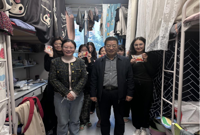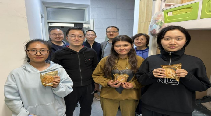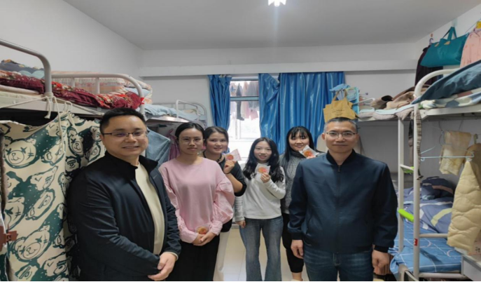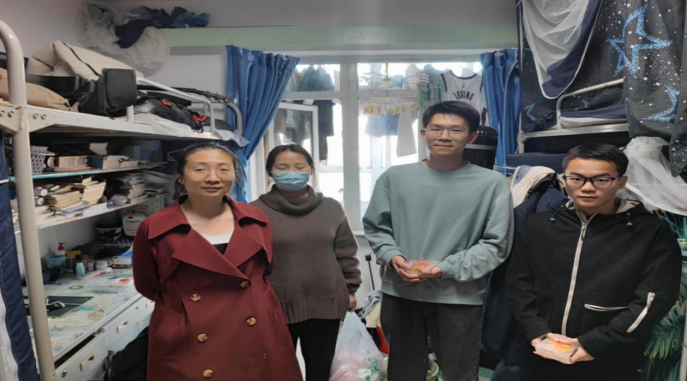 学院领导们带着月饼来到了学生宿舍。他们首先向学生们致以节日的问候和祝福,并详细了解了大家的学习和生活情况。还特别关注了学生们的生活习惯和身体健康情况,提醒大家注意保持良好的作息习惯和饮食习惯,保持宿舍整洁干净,加强锻炼,保持身体健康。