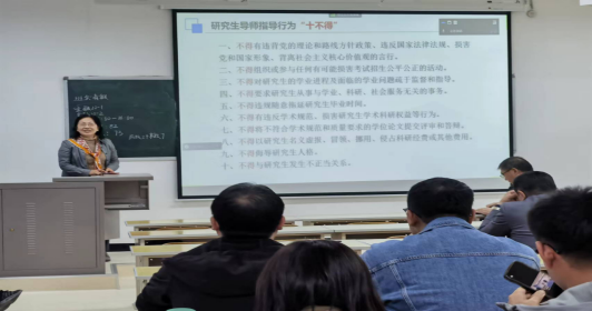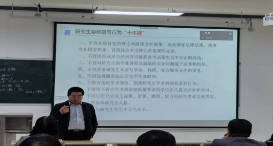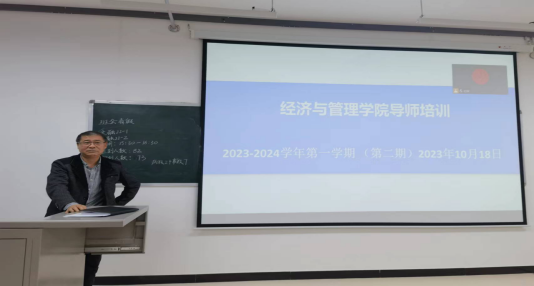 为深入学习贯彻党的二十大精神,贯彻落实习近平总书记对研究生教育工作的重要指示精神和全国研究生教育大会精神,加强研究生导师队伍建设,提高导师指导和培养研究生的能力,切实保障研究生培养质量,促进学校研究生教育事业的高质量发展,根据党委教师工作部和研究生院统一安排,2023年10月18日经济与管理学院在红湖校区11号楼218多媒体教室举办了本学年第二期导师培训,主要内容为《研究生导师指导行为准则》。