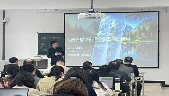 2024年3月20日下午,深圳点宽科技公司人工智能行业资深从业者毛朝选来我院做专题讲座。讲座名称“aigc:面向通用人工智能”。经济与管理学院教职工90余人听取讲座,会议由马晓东副院长主持。