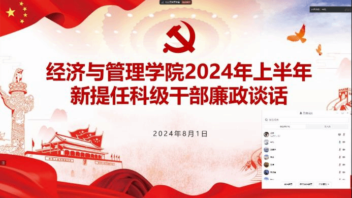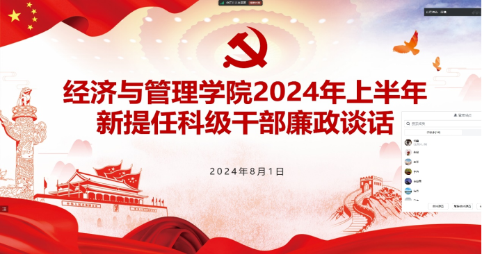 廉政谈话是加强党内监督的一项重要制度,是学院党委履行全面从严治党主体责任的具体举措,是健全完善干部监督管理机制的重要举措,也是落实落细政治监督,维护风清气正教书育人环境的具体措施。为进一步落实全面从严治党要求,加强对新提任科级干部的教育、监督和管理,教育引导年轻干部廉洁履职,以实际行动抓好班子、带好队伍、做好表率,提高党性修养、砥砺政治品格、锤炼过硬本领,以忠诚干净担当的实际行动,营造风清气正的工作氛围,为学校事业不断发展贡献自己的力量。根据新疆大学经济与管理学院党委安排,2024年8月1日16:00通过腾讯会议召开2024年上半年新提任科级干部廉政谈话会议。学院全体领导班子成员,新提任科级干部参加。