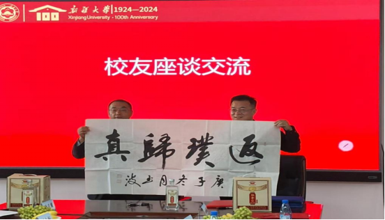 捐赠仪式结束后,学院领导与校友代表们进行了座谈,畅谈了学院在教学、科研和学生工作等方面取得的显著成绩,同时也分享了校友们在各自领域取得的卓越成就。李中华校友现场挥毫,写下“返璞归真”四字祝福学院。