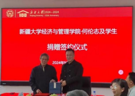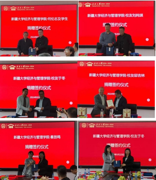 会议第五项是捐赠签约仪式,也是本次座谈会的核心环节。在新疆大学百年校庆之际,校友们通过慷慨捐赠,表达了对母校的深厚情谊和鼎力支持。在捐赠仪式上,马伟书记、孙景兵董事长和吕雁琴院长向何伦志教授和部分研究生、邸吉林、秦放鸣教授、刘纵超、郭君业、田国新、谢艳峰、于冬、刘纯琪等校友颁发了捐赠证书,感谢他们慷慨的捐赠,感谢他们对学院工作的支持,感谢他们对学院未来取得更大成绩的信心。