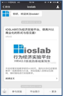 教育教学 “体验式教学, 维护学生主体地位, 降低教师工作压力, 提高教学效率”: 学生通过微信公众号(ioslab) 参与经管教学实验,以“游戏”的形式体验案例角色博 弈、互动、生活及工作等方面的心理活动和行为动机; 以案例体验式的教学方式, 促进 学生主动理解和掌握经济管理活动中的基本原理, 潜意识中提升对经济管理现象和问题 的独立思考能力和分析能力。同时, 以学生为主体的实验教学, 教师依据实验结果及学 生讨论内容进行引导和讲解, 将大大减少教师工作量, 使教学过程更加轻松。